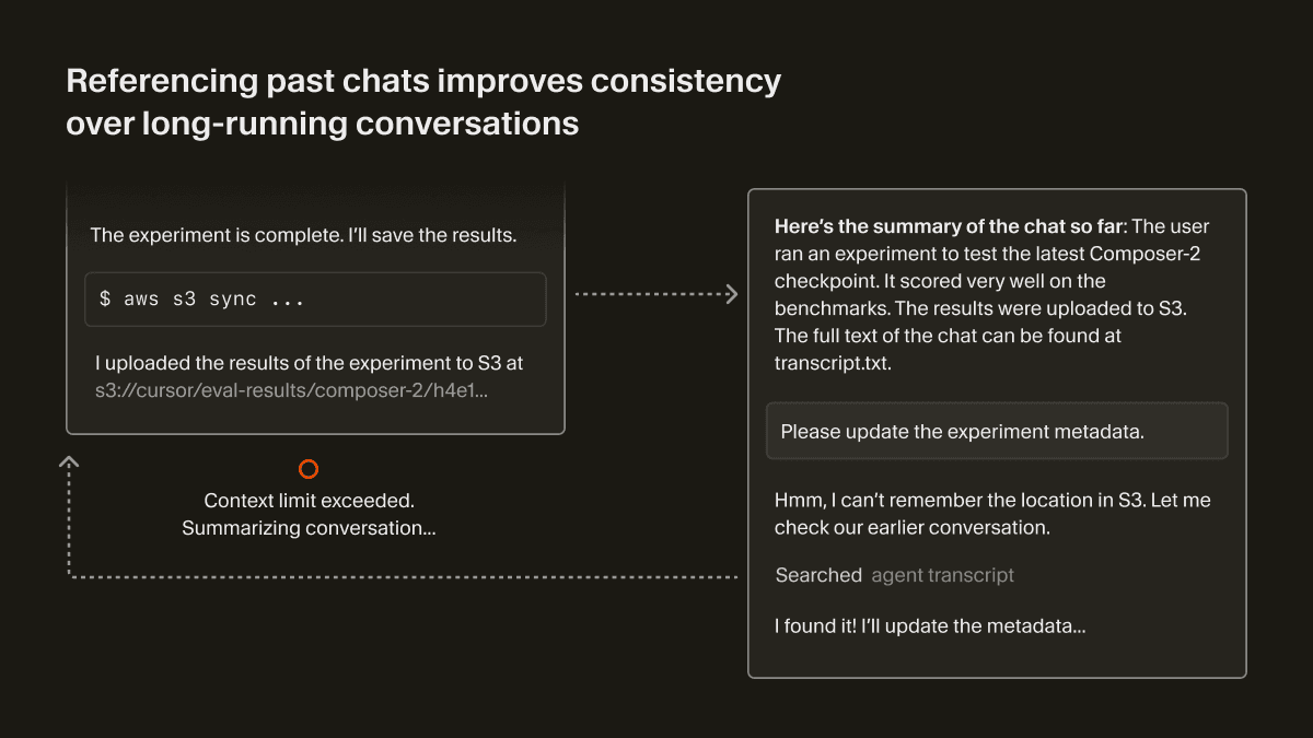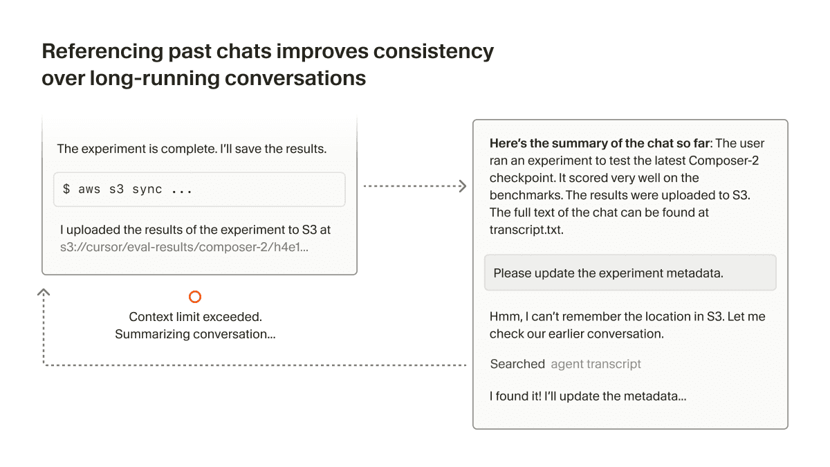 But the agent's knowledge can degrade after summarization since it's a lossy compression of the context. The agent might have forgotten crucial details about its task. In Cursor, we use the chat history as files to improve the quality of summarization.