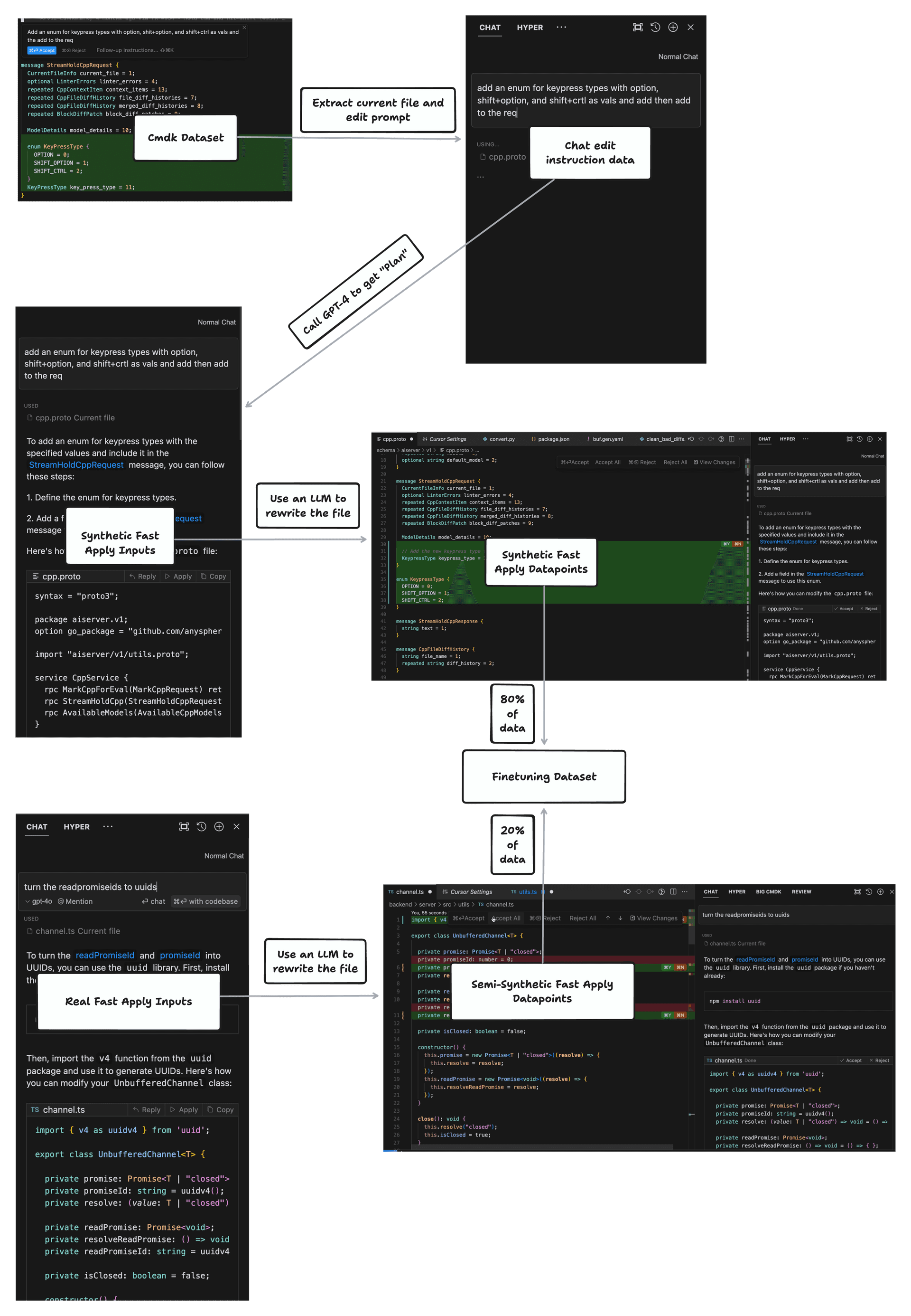For each edit instruction, we have GPT-4 produce a chat response given the current file, then have a language model "apply" the change. We use the small dataset of "real" apply inputs to produce additional higher-quality apply datapoints. Finally, we concatenate these datasets together in an 80/20 mix to get our finetuning data.