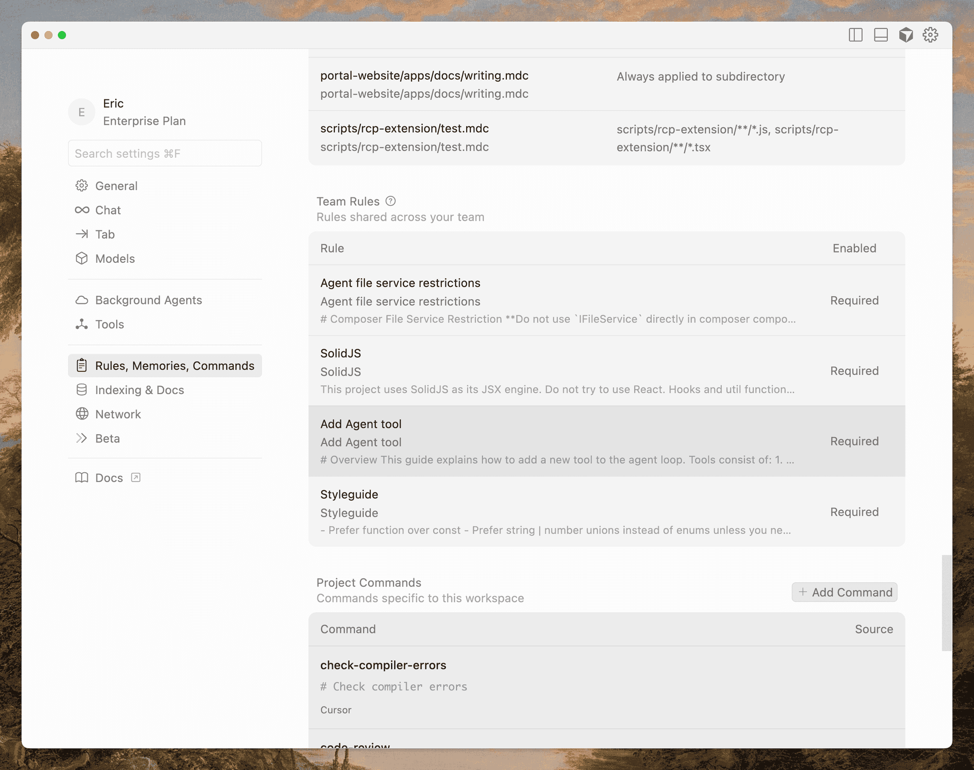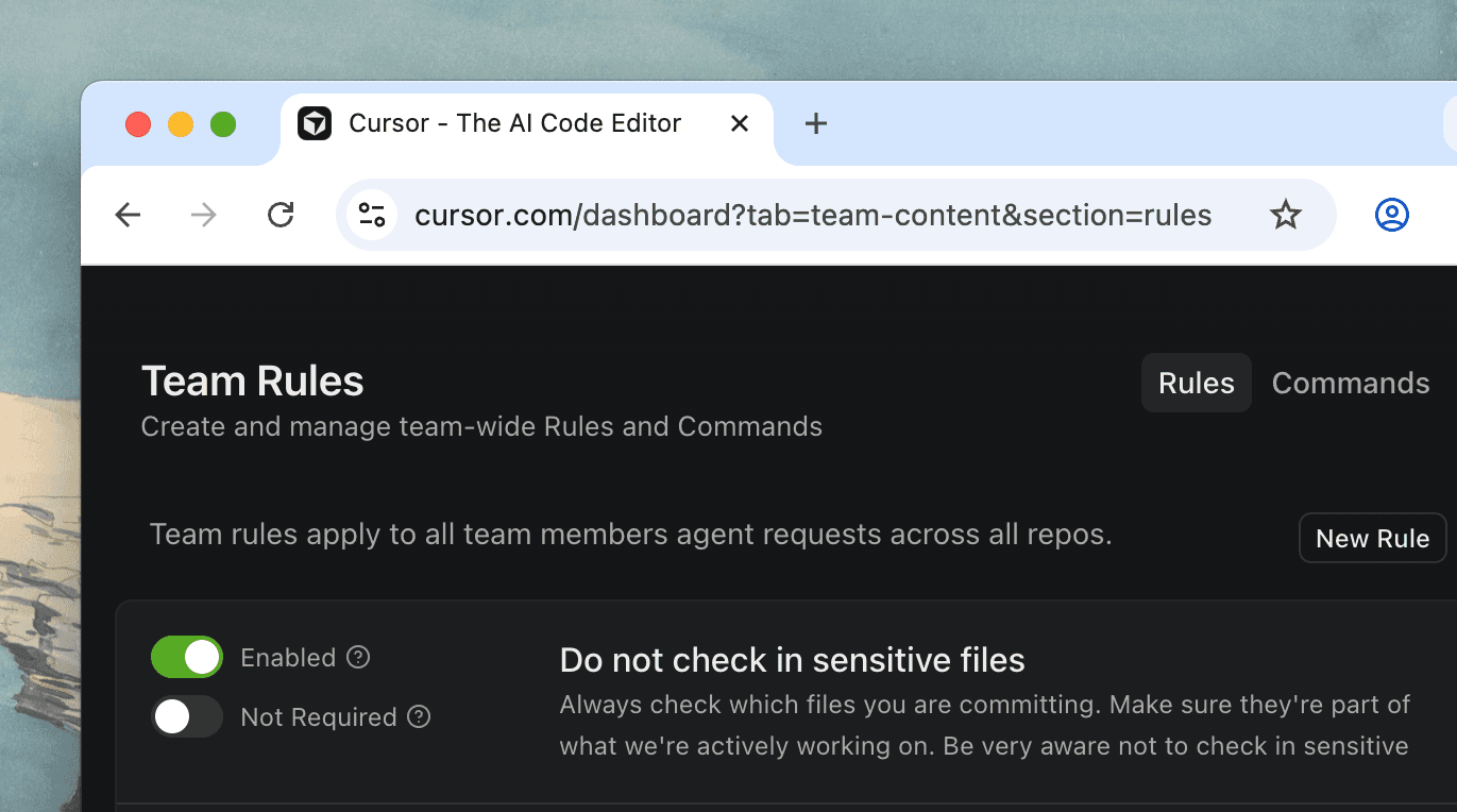 Define custom commands and rules for your Team in the Cursor dashboard.
